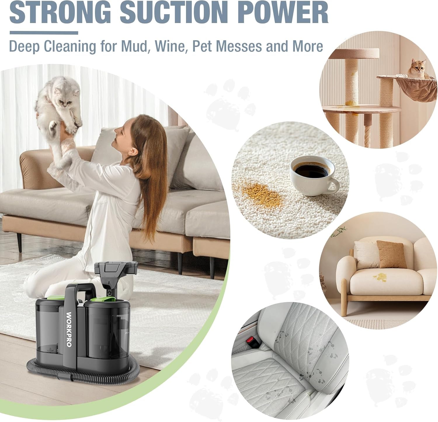 - WORKPRO POWERFUL UPHOLSTERY CLEANER: With a suction power of 13KPa, WORKPRO upholstery cleaner effectively tackles tough stains on carpets, sofas, tiles, and other surfaces, including pet urine, red wine, and coffee spills. After each cleaning session, your carpets will feel softer and furniture will look renewed, creating a cleaner, more comfortable living space for you and your family