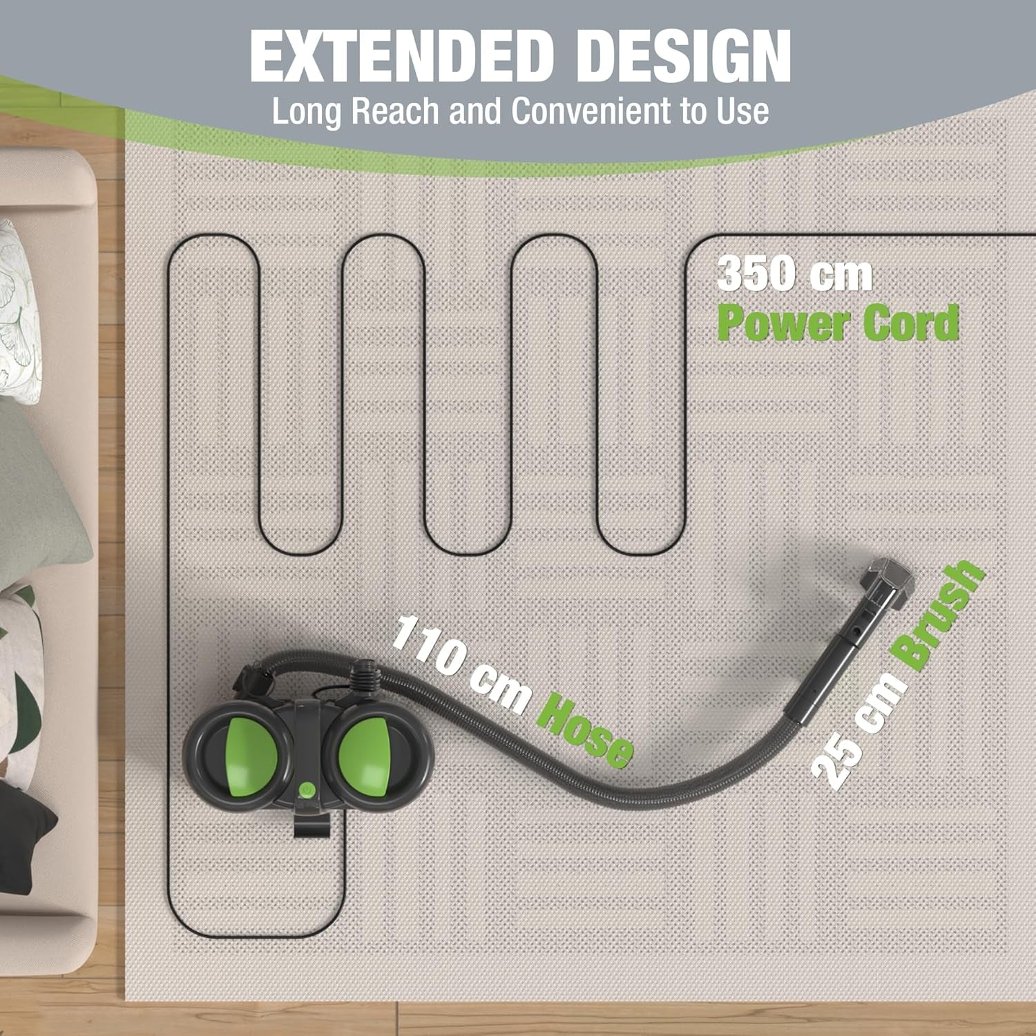 - PORTABLE & SPACE-SAVING: With an 3.5m power cord, 1.1m hose and 25cm brush, this upholstery cleaner machine offers wide coverage to